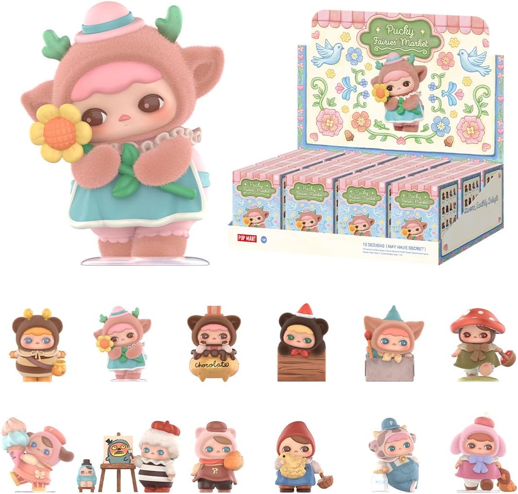 - POP MART PUCKY Fairies’ Market Series Figures: The blind box contains a random figure from a specific series. Each blind box only contains one figure. No one, including us, knows what’s inside. This collection contains 12 blind box figures, one of them might be the secret edition.